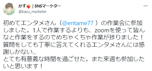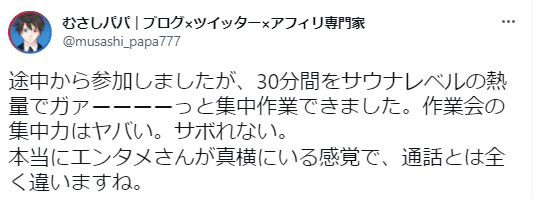A:作業会は作業するのがメインになりますが初心者で何を作業していいのかわからない場合は、学習時間に当ててもOKです。作業内容は個々により変わります。例えば、ツイート作成、コンテンツ作成、販売記事作成、コンセプト設計、プロフィール作成、記事作成などされている方が多いです。