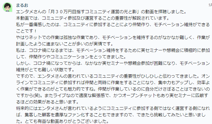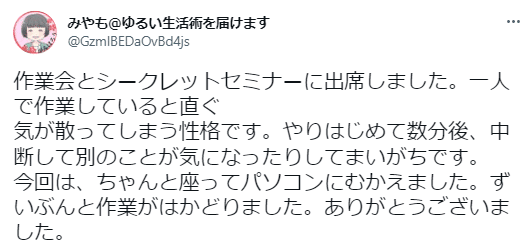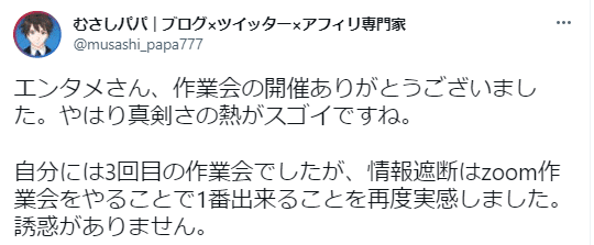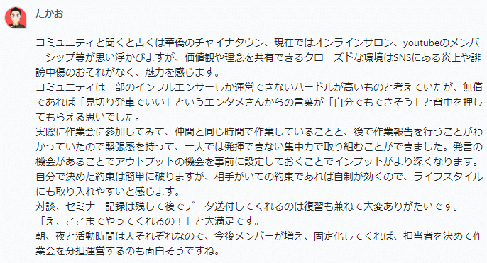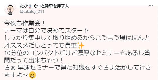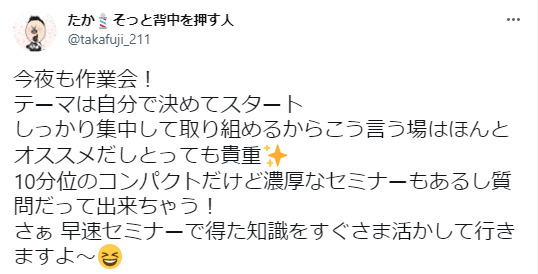 むしろ初心者のうちから作業会に参加すると、作業の習慣化につながったり、生のライブセミナーを視聴することでより学びも大きくなりその結果、成果が出るまでのスピードも早くなると感じています。