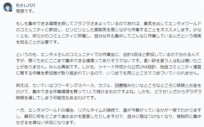 今回のエンタメワールドは、1人で作業が出来なかったりモチベーション維持に悩んでいる方はもちろん、