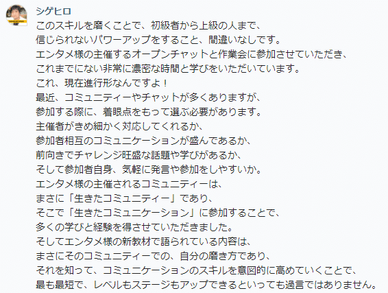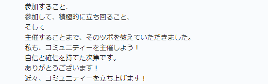 →コミュニティ運営をされていない方はまだまだ沢山います。最初は実際に参加して体験してみるのがベストです。そして、運営側にまわるのを目指します。効果的な運営をすることであなたの売上のゼロが1つ2つと増えていきます。そのための方法と裏側を大暴露します。