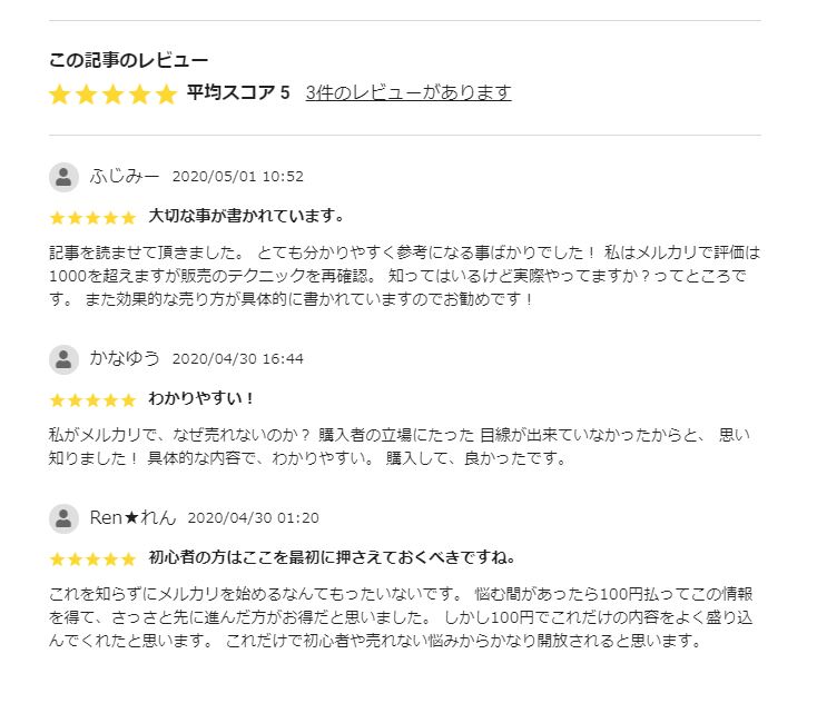 記事を読ませて頂きました。 とても分かりやすく参考になる事ばかりでした! 私はメルカリで評価は1000を超えますが販売のテクニックを再確認。 知ってはいるけど実際やってますか?ってところです。 また効果的な売り方が具体的に書かれていますのでお勧めです!