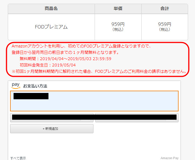 表示されている「FODプレミアム」の申し込み画面を、下にスクロールして、「お支払いにAmazon Payを利用する」のチェックボックスに、チェックマークを入れてから、一番下の「購入確定」ボタンをクリックしてください